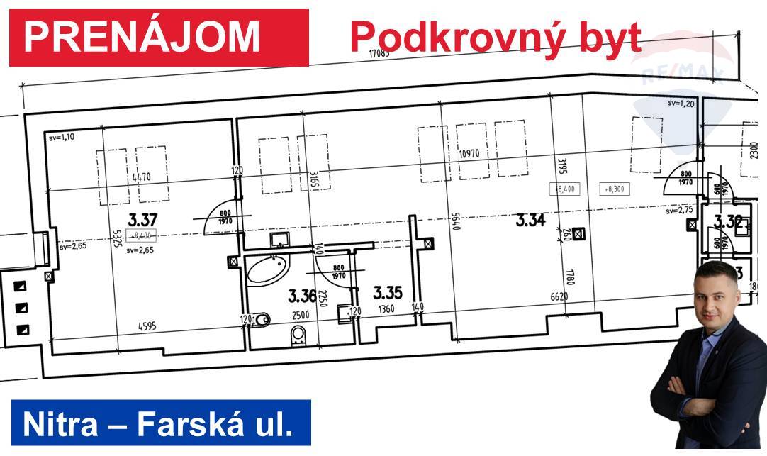 Realitná kancelária RE/MAX ponúka na prenájom 2-izbový podkrovný byt s výmerou 81 m² v budove „Ondrejov dom“, ktorá sa nachádza v historickej časti Starého mesta na Farskej ulici 10. Byt je umiestnený na 3. poschodí “podkrovný priestor“ polyfunkčnej budove. Budovu si prenajímajú prevažne klienti z oblasti zdravotníctva a služieb (kozmetické, kadernícke a masážne salóny). ________________________________________ Dispozícia a vybavenie • Dispozícia: Vstup do otvoreného priestoru, ktorý tvorí prepojenie s kuchynskou linkou. Ďalej je v byte samostatná izba a toaleta s umývadlom a rohovou vaňou. • Vybavenie: Celý priestor pôsobí veľmi útulným a priestranným dojmom. Objekt je osvetlený a vybavený kamerovým systémom. • Upratovanie: Upratovanie spoločných priestorov je zahrnuté v cene nájmu. ________________________________________ Podmienky prenájmu • V cene sú zahrnuté energie. • Výška depozitu: Jednomesačné nájomné. • Doba nájmu: Minimálne jeden rok v prípade nájmu na dobu určitú. • Výpovedná lehota: V prípade nájmu na dobu neurčitú je trojmesačná. V prípade viacerých záujemcov bude nehnuteľnosť prenajatá najvýhodnejšej ponuke podľa preferencií majiteľa. Uvedená cena je vrátane provízie realitnej kancelárie RE/MAX.