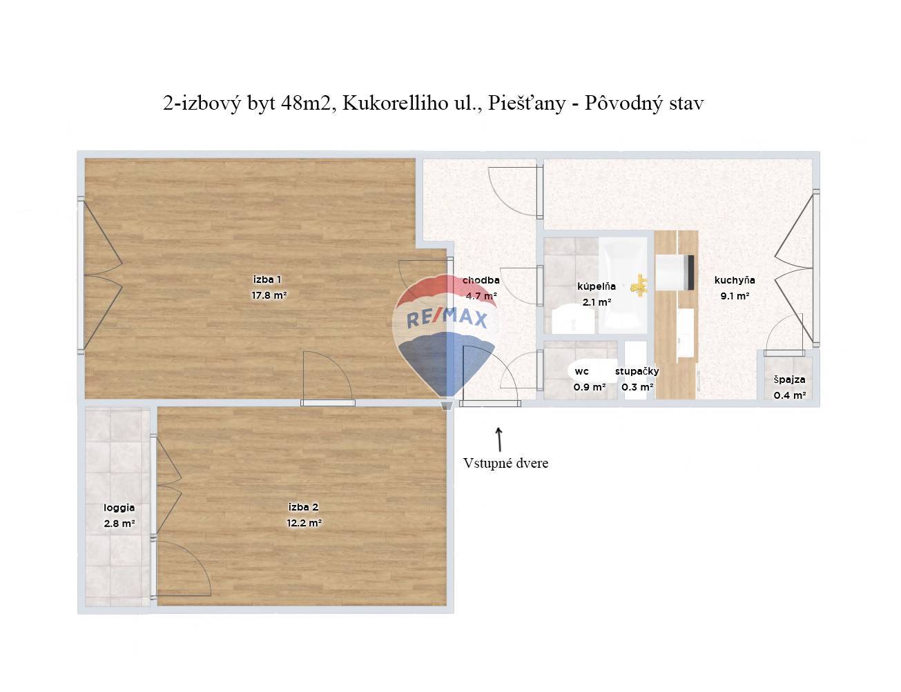 RE/MAX Vám ponúka na predaj 2-izbový byt s loggiou v pôvodnom stave, pripravený na rekonštrukciu. Lokalita Mikrorajón / Kukorelliho ulica je známa pre svoje dobré susedské vzťahy, tiché bývanie mimo hlavných ciest, a výbornou dostupnosťou do centra Piešťan. Čím je byt výnimočný? - Mikrorajón je skrytý poklad Piešťan - poloha blízko centra mesta - obchodný dom Kocka aj Aupark, supermarkety Billa aj Lidl do 10 minút peši - lokalita plná zelene, bezproblémové parkovanie, cyklotrasa - výhľady ponad strechy domov - úplne pôvodný stav, na kompletnú prerábku podľa vášho vkusu Dispozícia bytu: - úžitková plocha 48 m2 + loggia - pôvodné jadro (umakart + tehla) - 3/3 poschodie bez výťahu - orientácia Juhozápad (obývačka, spálňa + loggia), Severovýchod(ranná káva v kuchyni) - okná: 2x plastové 2-sklo; v izbe s loggiou je pôvodné drevené okno a pôvodná (umakartová?) stena - pôvodné drevené parkety v izbách, staré lino v kuchyni, kúpeľni a chodbe - vstupné aj interiérové dvere pôvodné - v suteréne bytového domu latková pivnica - spoločné priestory (kočikáreň, bicykláreň) na prízemí - vymenené stupačky, inak všetko pôvodný stav Byt je vyprataný a pripravený na Vašu rekonštrukciu. Bytový dom: - rok kolaudácie: 1970 - materiál: tehla - r. 2014 dom zateplený, nová strecha, fasáda a vstupné dvere, elektronický vrátnik - vo vchode 8 bytov, veľmi dobré susedské vzťahy - v okolí veľa zelene a kompletná občianska vybavenosť V prípade viacerých záujemcov o kúpu si majiteľ nehnuteľnosti vyhradzuje právo vybrať si kupujúceho na základe jeho zvolených kritérií. V cene nehnuteľnosti je zahrnutý kompletný servis: Poskytnutie komplexných realitných a právnych služieb, vypracovanie rezervačnej zmluvy a kúpnej zmluvy s návrhom na vklad kúpnej zmluvy právnikom, uhradenie poplatku za osvedčenie podpisov kúpnej zmluvy, uhradenie právneho poplatku za návrh na vklad kúpnej zmluvy do katastra nehnuteľností, súčinnosť pri odovzdaní nehnuteľnosti a pomoc pri prepisoch všetkých energií, provízia RK. Hypotekárne poradenstvo pod jednou strechou - využite výhodu spolupráce s našimi overenými partnermi a získajte najvýhodnejšiu hypotéku na trhu!