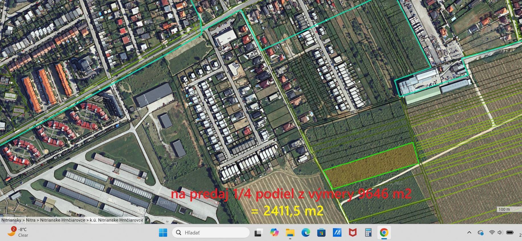 Exkluzívne iba u nás! Realitná kancelária RE/MAX ponúka na predaj podiel vo veľkosti 1/4 na investičnom pozemku v katastrálnom území Nitrianske Hrnčiarovce (extravilán) s celkovou výmerou 9646 m2. Tento pozemok je ideálny ako dlhodobá investícia. Nachádza sa v exkluzívnej lokalite pod Zoborom, ktorá je známa nádherným panoramatickým výhľadom a pokojnou atmosférou. V tesnej blízkosti sa nachádza existujúca zástavba rodinných domov, čo zaručuje príjemné a bezpečné prostredie. Významnou devízou tejto nehnuteľnosti je plánované prepojenie mestskej časti Zobor so Zlatomoraveckou cestou, vďaka čomu sa lokalita výrazne zhodnotí a získa komfortný, rýchly prístup do centra mesta. Cena za m2 je stanovená na 55 €, čo predstavuje atraktívnu príležitosť pre investorov. Ak hľadáte výnimočný pozemok s potenciálom rastu hodnoty a krásnym výhľadom, neváhajte ma kontaktovať pre viac informácií. *Možnosť prikúpenia ďalších 1888 m² ornej pôdy mimo zastavaného územia v katastri obce Nitrianske Hrnčiarovce. Jedná sa o čistý podiel toho istého vlastníka, parcely registra „E“ sú evidované na rovnakom Liste vlastníctva. Uvedená cena je vrátane provízie realitnej kancelárie RE/MAX, kompletného právneho servisu, autorizovaných zmlúv a poplatkov spojených s prevodom vlastníckych práv.